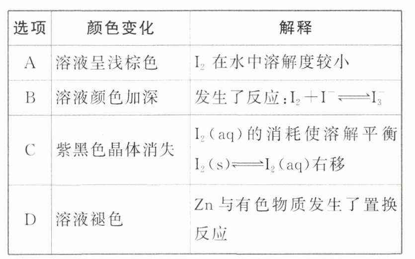 7.D 解析紫黑色晶体的存在,表明$I_{2}$在水中溶解度小,形成浅棕色溶液,A正确;$Zn$与$I_{2}$反应生成$I$,$I$与$I_{2}$结合形成$I_{3}^{-}$:$I^{-}+I_{2}\rightleftharpoons I_{3}^{-}$,$I_{3}^{-}$浓度增大促进了$I_{2}$的溶解,溶液颜色加深,B、C均正确;$Zn$与$I_{2}$反应生成$ZnI_{2}$,该反应为化合反应,D错误。