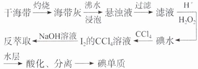 干海带$\xrightarrow{灼烧}$海带灰$\xrightarrow{沸水浸泡}$悬浊液$\xrightarrow{过滤}$滤液$\xrightarrow{H^+}$H₂O₂$\xrightarrow{CCl_4}$碘水$\xrightarrow{NaOH溶液}$反萃取$\xrightarrow{酸化、分离}$碘单质