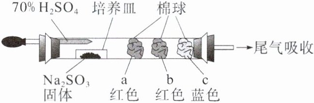 某微型实验装置(夹持仪器已省略)如图所示,其中 a 棉球蘸有品红溶液,b 棉球蘸有含酚酞的$NaOH$溶液,c 棉球蘸有$I_2$与淀粉的混合溶液。实验时将$70\% H_2SO_4$滴入装有$Na_2SO_3$固体的培养皿中。下列说法错误的是(