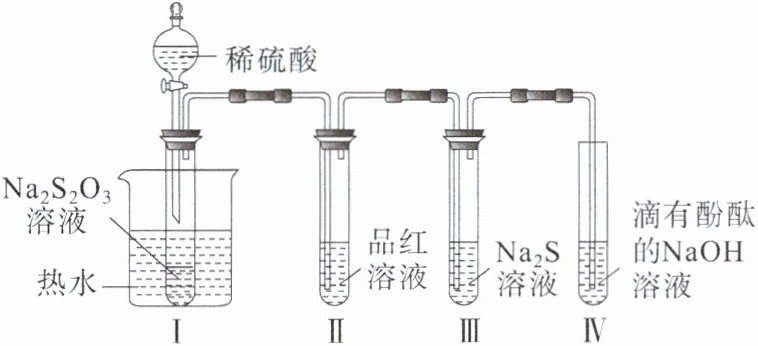 例1 C 解析 I中试管内发生反应$\mathrm{S_2O_3^{2-}+2H^+=S\downarrow+SO_2\uparrow+H_2O}$,氢元素化合价不变,$\mathrm{H^+}$不体现氧化性,A错误;II中品红溶液褪色,体现$\mathrm{SO_2}$的漂白性,B错误;I试管内发生反应$\mathrm{S_2O_3^{2-}+2H^+=S\downarrow+SO_2\uparrow+H_2O}$,III试管内发生反应$\mathrm{2S^{2-}+SO_2+2H_2O=3S\downarrow+4OH^-}$,I和III的试管中都出现了浑浊现象,C正确;撤掉水浴,重做实验,反应速率减慢,IV中红色褪去的速率减慢,D错误。