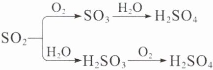 $SO_2 \begin{cases}\xrightarrow{O_2} SO_3 \xrightarrow{H_2O} H_2SO_4 \\\xrightarrow{H_2O} H_2SO_3 \xrightarrow{O_2} H_2SO_4\end{cases}$
