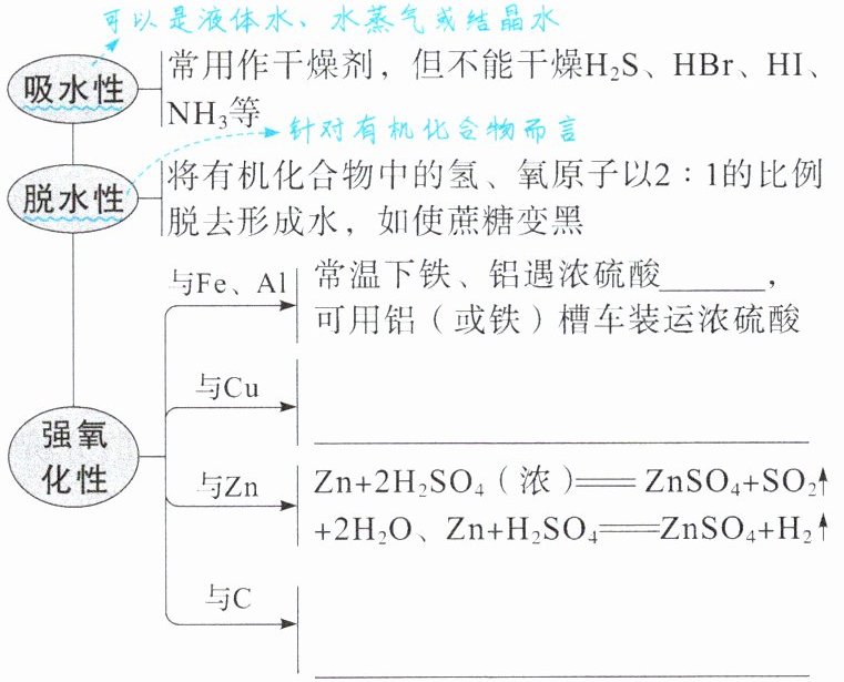 3.钝化 $Cu + 2H_2SO_4(浓) \xlongequal{\triangle} CuSO_4 + SO_2 \uparrow + 2H_2O$ $C + 2H_2SO_4(浓) \xlongequal{\triangle} CO_2 \uparrow + 2SO_2 \uparrow + 2H_2O$ 应用示例: