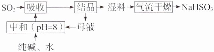 对点训练2 B 解析根据工艺流程逆向分析可知,以二氧化硫和纯碱为原料,得到结晶成分为$NaHSO_3$,则母液为饱和$NaHSO_3$和过量的二氧化硫形成的亚硫酸,溶液呈酸性。加入纯碱进行中和:$H_2SO_3 + 2Na_2CO_3 \longrightarrow Na_2SO_3 + 2NaHCO_3$,$NaHSO_3 + Na_2CO_3 \longrightarrow Na_2SO_3 + NaHCO_3$,调节pH为8进行中和后得到$Na_2SO_3$和$NaHCO_3$,通入二氧化硫气体进行混合吸收:$Na_2SO_3 + SO_2 + H_2O \longrightarrow 2NaHSO_3 \downarrow$,$SO_2 + NaHCO_3 \longrightarrow CO_2 + NaHSO_3$,此时会析出大量$NaHSO_3$晶体,经过离心分离,将得到的湿料再进行气流干燥,最终得到$NaHSO_3$产品。吸收过程中有二氧化碳生成,A正确;结晶后母液中含饱和$NaHSO_3$和过量的二氧化硫形成的亚硫酸,没有$NaHCO_3$,B错误;$NaHSO_3$高温时易分解变质,气流干燥过程中温度不宜过高,C正确;中和后溶液中含$Na_2SO_3$和$NaHCO_3$,D正确。
