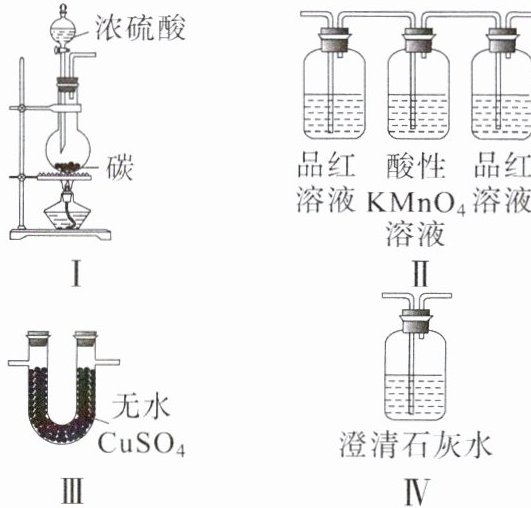 4.C 解析加热时,浓硫酸与碳反应生成$CO_2$、$SO_2$和$H_2O$,浓硫酸只表现强氧化性,A错误;气体通过溶液要带出水蒸气,验证产物要先通过Ⅲ中无水硫酸铜检验水蒸气,故正确连接顺序为Ⅰ→Ⅲ→Ⅱ→Ⅳ,B错误;装置Ⅱ中左侧品红溶液用于检验$SO_2$,酸性$KMnO_4$溶液用于除去$SO_2$,右侧品红溶液用于检验$SO_2$是否除净,C正确;若连接顺序为Ⅰ→Ⅱ→Ⅲ→Ⅳ,只要Ⅱ中右侧品红溶液不褪色,Ⅳ中石灰水变浑浊,可证明产物含$CO_2$,D错误。