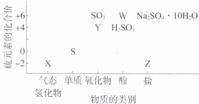 2.B 解析图示为硫元素的“价—类二维图”,X为$H_2S$,Y为$SO_2$,W为$H_2SO_3$。自然界中火山口存在单质硫,A错误;Z为含-2价S元素的盐,$CuFeS_2$中S元素为-2价,工业生产可用于冶炼铜,B正确;X为$H_2S$,是电解质,Y为$SO_2$,是非电解质,两者可以反应生成S单质,C错误;常温下,Al遇浓硫酸钝化,钝化为化学反应,D错误。