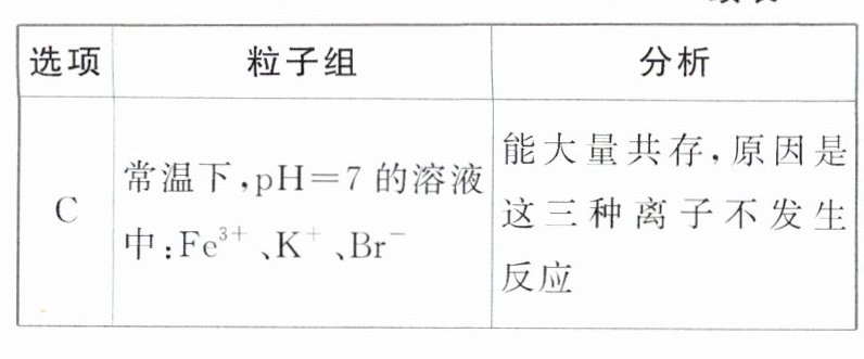 常温下,${K_{sp}[Fe(OH)_{3}] \approx 1.0 × 10^{-39}}$。下列有关离子大量共存的分析正确的是(