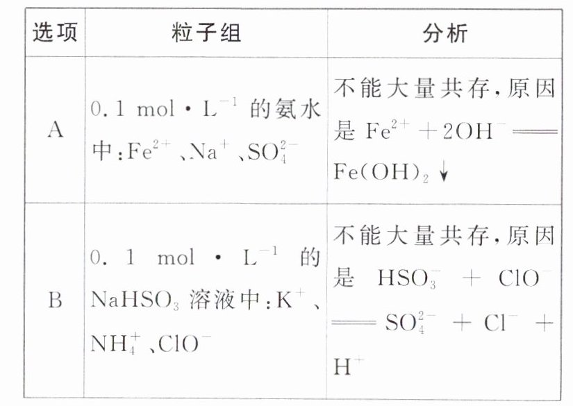 对点训练2 B 解析 一水合氨是弱碱,正确的离子方程式为$Fe^{2+} + 2NH_3 · H_2O = Fe(OH)_2 \downarrow + 2NH_4^+$,A错误;$ClO^-$可氧化$HSO_3^-$生成硫酸根离子,B正确;根据$K_{sp}[Fe(OH)_3] \approx 1.0 × 10^{-39}$计算,$pH=7$时,$c(Fe^{3+}) \approx 1 × 10^{-18} mol · L^{-1}$,故$Fe^{3+}$不能大量存在,C错误;加入铝粉产生氢气的溶液可能是强碱性溶液,也可能是强酸性溶液,在强酸性溶液中,$NO_3^-$具有强氧化性,与铝反应不会产生$H_2$,强碱性溶液中$Mg^{2+}$不能大量存在,D错误。