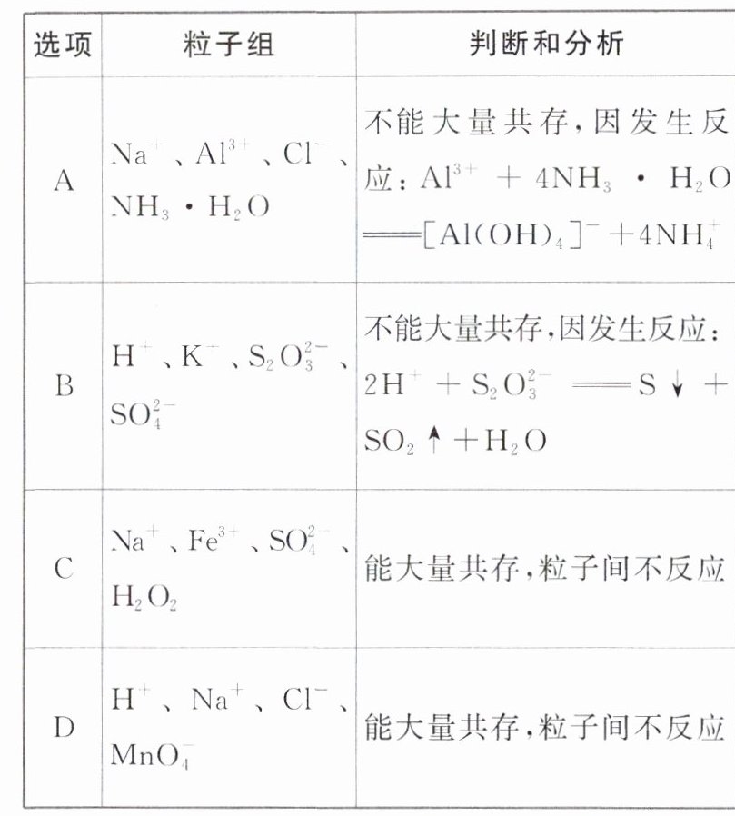 例2 B 解析 $Al^{3+}$和$NH_3 · H_2O$生成$Al(OH)_3$沉淀而不是生成$[Al(OH)_4]^-$,A错误;$S_2O_3^{2-}$和$H^+$反应生成单质硫、二氧化硫和水,离子方程式为$2H^+ + S_2O_3^{2-} = S \downarrow + SO_2 \uparrow + H_2O$,B正确;$Fe^{3+}$可催化$H_2O_2$分解生成$H_2O$和$O_2$,不能大量共存,C错