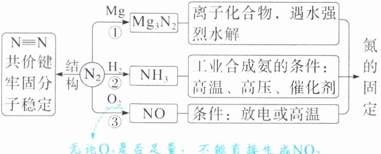 (2)①$3Mg +N_2\overset{点燃}{=}Mg_3N_2$ ②$N_2 +3H_2 \underset{催化剂}{\overset{高温、高压}{\rightleftharpoons }}2NH_3$ ③$N_2 +O_2\overset{放电或高温}{=}2NO$
