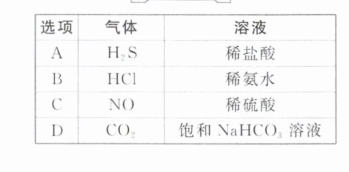 例2 B 解析 烧瓶中气体溶于溶液或二者发生反应,导致烧瓶中气体压强明显减小,产生较大压强差,能出现喷泉现象。H₂S与稀盐酸、NO与稀硫酸、CO₂与饱和NaHCO₃溶液均不反应,不能形成喷泉,A、C、D错误。