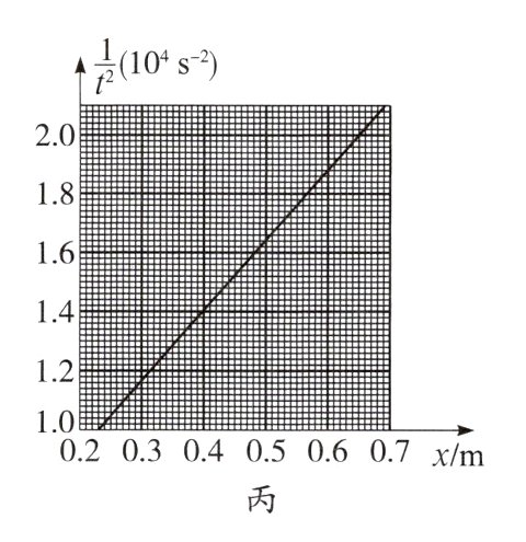 (2)根据实验测得的数据,以x为横坐标,$\frac{1}{t^{2}}$为纵坐标,在坐标纸中作出$\frac{1}{t^{2}} - x$图线如图丙所示,求得该图线的斜率k = ________ m⁻¹·s⁻²;由此进一步求得滑块的加速度a = ________ m/s²。(计算结果均保留3位有效数字)