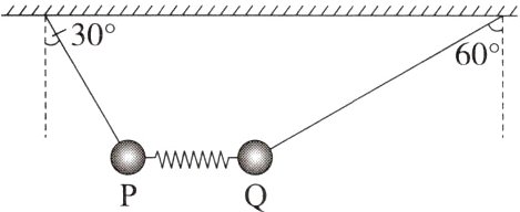 6. (2023广东揭阳模拟)如图所示,用两根不可伸长的轻绳分别连接由水平弹簧相连的两小球$P$、$Q$,并将轻绳悬挂在水平天花板上,$P$、$Q$均处于静止状态。已知与$P$、$Q$连接的轻绳和竖直方向的夹角分别为$30^{\circ}$、$60^{\circ}$,弹簧处于弹性限度内,则两小球的质量之比$\frac{m_P}{m_Q}=$( )