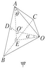 11.C 解析根据题意,设l_OA = l_OB = l_OC = L,由于三根完全相同的轻质细杆两两互成90°,则l_AB = l_BC = l_CA=\sqrt{2}L,过O、O'、A分别作AE、AB、BC的垂线,如图甲所示,则l_AD = l_BE=\frac{1}{2}l_AB=\frac{\sqrt{2}}{2}L,可得l_OE=\sqrt{l_OB^2 - l_BE^2}=\frac{\sqrt{2}}{2}L,由于△ABC是等边三角形且AE⊥BC,则l_O'D = l_O'E = l_AD\tan30^{\circ}=\frac{L}{\sqrt{6}},l_O'A=\frac{l_AD}{\cos30^{\circ}}=\sqrt{\frac{2}{3}}L,可得\cosθ=\frac{l_O'A}{l_OA}=\sqrt{\frac{2}{3}},\sinα=\frac{l_O'E}{l_OA}=\frac{1}{\sqrt{3}},对O点受力分析,可知BO与CO对O点的合力(设为F)沿EO方向,则O点受力可简化为如图乙所示,由平衡条件得F_AO\cosθ+F\sinα = mg,F_AO\sinθ = F\cosα,联立解得F_AO=\sqrt{\frac{2}{3}}mg,故选C。