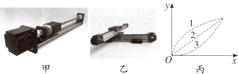 4.(2023浙江十校联考)一个单线轨直线滑台模组如图甲所示,滑块可以在电路的控制下做各种直线运动。现将两个相同的单线轨直线滑台模组十字组合成一个整体,并将一支笔固定在一个滑块上,如图乙所示。笔沿y轴匀速移动,同时沿x轴分别匀速、匀加速、匀减速移动,得到了1、2、3三条笔尖的运动轨迹,如图丙所示。下列关于笔尖的运动轨迹,判断正确的是( )