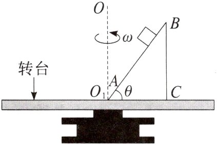 9. (多选)(2024湖南长沙模拟)如图所示,倾角$\theta = 53^{\circ}$的斜面$ABC$固定在可以绕竖直轴转动的水平转台上,斜面最低点$A$在转轴$OO_1$上。转台以角速度$\omega$匀速转动时,将质量为$m$的小物块(可视为质点)放置于斜面上,经过一段时间后小物块与斜面一起转动且相对斜面静止在$AB$线上,此时小物块到$A$点的距离为$L$。已知小物块与斜面之间的动摩擦因数为$0.5$,重力加速度为$g$,若最大静摩擦力等于滑动摩擦力,$\sin53^{\circ}=0.8$,$\cos53^{\circ}=0.6$。则物块相对斜面静止时( )