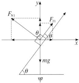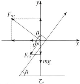 AC 解析当角速度最小时,物块恰好不下滑,受力分析如图甲所示,$y$轴方向根据平衡条件得$F_{N1}\cos\theta+F_{f1}\sin\theta = mg$,$x$轴方向根据牛顿第二定律得$F_{N1}\sin\theta - F_{f1}\cos\theta = m\omega_{1}^{2}L\cos\theta$,又$F_{f1}=\mu F_{N1}$,联立解得$\omega_{1}=\sqrt{\frac{5g}{6L}}$,$F_{N1}=mg$;当角速度最大时,物块恰好不上滑,受力分析如图乙所示,$y$轴方向根据平衡条件得$F_{N2}\cos\theta = F_{f2}\sin\theta+mg$,$x$轴方向根据牛顿第二定律得$F_{N2}\sin\theta - F_{f2}\cos\theta = m\omega_{2}^{2}L\cos\theta$,又$F_{f2}=\mu F_{N2}$,联立解得$\omega_{2}=\sqrt{\frac{55g}{6L}}$,$F_{N2}=5mg$。由以上分析可知,角速度取值范围为$\sqrt{\frac{5g}{6L}}\leq\omega\leq\sqrt{\frac{55g}{6L}}$,小物块对斜面的压力大小$F_{N}' = F_{N}$,取值范围为$mg\leq F_{N}'\leq5mg$。故选AC。