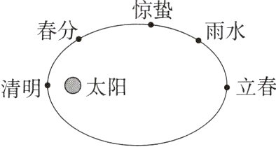 8.(2024福建福州模拟)某国际团队发现了3颗隐藏在太阳强光中的近地小行星,将其中一颗命名为2021PH27。在一年中的前5个节气间该小行星的位置如图所示。已知该小行星近日点到太阳的距离为日地距离的$\frac{2}{15}$,一年近似取360天,可近似认为24个节气在一年内均匀分布。可能用到的数据:$\sqrt[3]{\frac{1}{7}} = 0.52$,$\sqrt[3]{\frac{1}{9}} = 0.48$,$\sqrt[3]{\frac{1}{10}} = 0.46$。则该小行星经过近日点和远日点时的动能之比约为( )