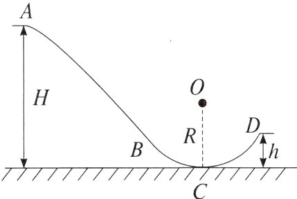 AC 解析:由A到C机械能守恒,则到达C点时的动能为$E_{k}=mgH$,A正确;根据$\frac{1}{2}mv_{C}^{2}=mgH$,$F_{C}-mg=m\frac{v_{C}^{2}}{R}$,解得$F_{C}=mg+\frac{2mgH}{R}$,则到达C点对轨道的压力大小为$F_{C}'=mg+\frac{2mgH}{R}$,B错误;从A到D由机械能守恒定律$mg(H - h)=\frac{1}{2}mv_{D}^{2}$,解得到起跳台D点的速度大小$v_{D}=\sqrt{2g(H - h)}$,C正确;从C点到D点重力势能增大了$mgh$,D错误。