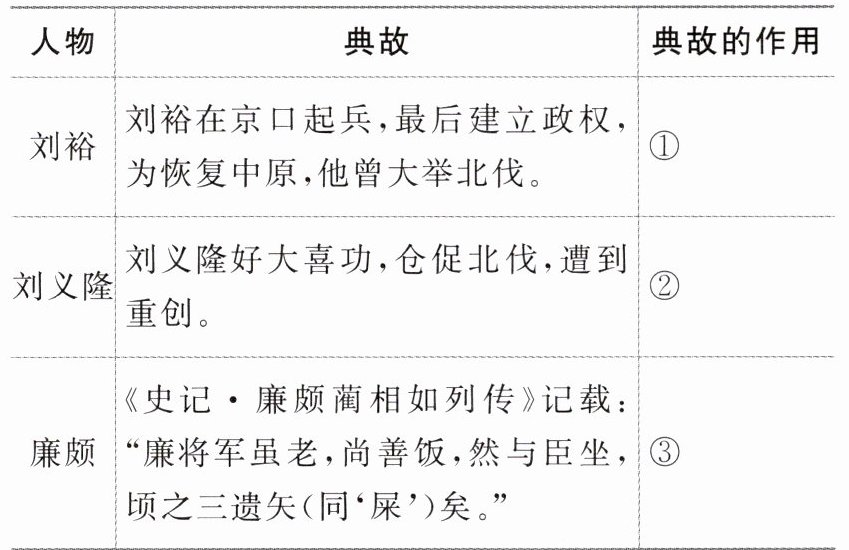 2. 用典是辛弃疾词的特点之一,《永遇乐·京口北固亭怀古》的用典极具代表性。试结合词句内容填出下表。