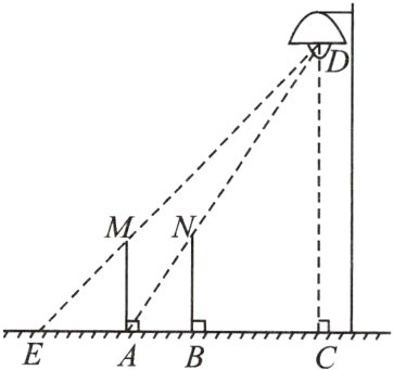 17. 一天晚上,李明和张龙利用灯光下的影子长来测量一路灯D的高度. 如图,当李明走到点A处时,张龙测得李明直立时身高AM与其影子长AE正好相等;接着李明沿AC方向继续向前走,走到点B处时,李明直立时身高BN的影子恰好是线段AB,测得AB = 1.25 m. 已知李明直立时的身高为1.75 m,求路灯的高CD(结果精确到0.1 m).