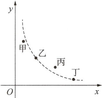 5. 某市举行中学生科普知识竞赛。如图,用四个点分别描述甲、乙、丙、丁四所学校竞赛成绩的优秀率$y$(该校竞赛成绩优秀的人数与该校参加竞赛人数的比值)与该校参加竞赛人数$x$的情况,其中描述乙、丁两所学校情况的点恰好在同一个反比例函数的图象上,则这四所学校在这次科普知识竞赛中成绩优秀人数最多的是( )。