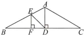 (上海中考)如图,一座钢结构桥梁的框架是△ABC,水平横梁BC长18m,中柱AD高6m,其中点D是BC的中点,且AD⊥BC.现需要加装支架DE,EF,其中点E在AB上,BE = 2AE,且EF⊥BC,垂足为F,求支架DE的长.
