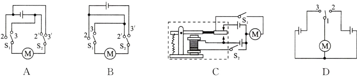 10. 设计一个电路,使直流电动机在人的操作下既能正转,也能反转。电动机的符号是M,下图是班里同学们设计的电路,其中不能实现设计要求的是( )。
