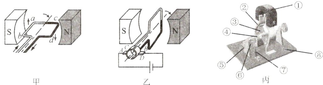 (3) 图丙中的电动机模型中,调换器件__________(填图丙中的数字序号)的放置可方便改变电动机的转动方向。通电后,电动机模型不转动,若是接触不良,可以把铜片(电刷)再弯曲一下,以增加它的________(填物质的物理属性)。