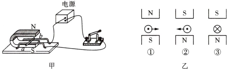 11. 图甲是探究通电导线在磁场中受力作用的实验装置。闭合开关,观察到导线ab向右运动,记录现象如图乙①所示(图乙①②③是该实验装置的剖面图,其中⊙表示电流垂直向外流出,⊗表示电流垂直向里流进)。接着把磁体的N、S极对调,记录的现象如图乙②所示。