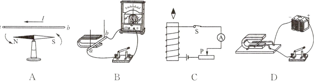 3. 如图,由两根绝缘细线悬挂着的导体ab放在蹄形磁体中央,ab两端连接着导线。在虚线框中接入某种实验器材可进行相应的实验探究。下列说法正确的是( )。