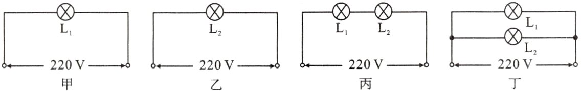 13. 某研究性学习小组利用标有“220 V 40 W”的灯泡$L_{1}$和标有“220 V 15 W”的灯泡$L_{2}$所设计的四个电路图如下所示,当把它们分别接入同一家庭电路中时,对甲、乙、丙、丁四个电路消耗的实际功率大小排列正确的是( )。