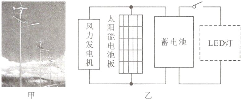 11. “碳达峰”是指我国承诺在2030年前,二氧化碳排放达到峰值后将逐步降低,不再增长,这一庄重承诺体现了我国的科技实力。其中节能减排的一项重要措施就是逐步将我国现有的约2亿只传统路灯替换成使用风能和太阳能的风光互补路灯。某公司生产的风光互补LED路灯外形和电路原理图分别如图甲、乙所示。它“头顶”小风扇,“肩扛”太阳能电池板,“腰挎”节能灯。下列说法正确的是( )。