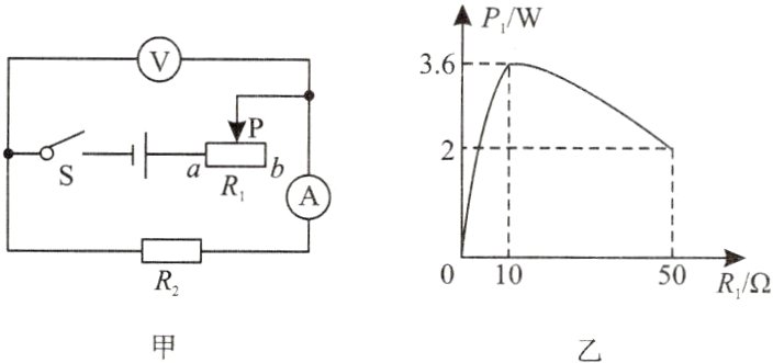 6. 如图甲所示,电源电压保持不变,闭合开关S,滑动变阻器的滑片P从a端移至b端的过程中,$R_{1}$消耗的电功率$P_{1}$随$R_{1}$阻值变化关系如图乙所示。下列分析错误的是( )。