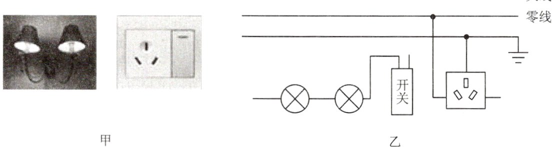 6. 图甲为小明家卧室内的“一开一插”式开关和两盏“220V 10W”的壁灯,其部分电路如图乙所示。开关能同时控制两盏壁灯和三孔插座,闭合开关时两盏壁灯都能正常发光,请将其电路连接完整。