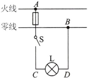 10. 如图,闭合开关S后,发现电灯L不亮,且保险丝没有熔断。某同学用试电笔测试灯头的两根电线C、D处,发现这两处都能使试电笔的氖管发光,再用试电笔测试火线A处和零线B处时,氖管在测火线A处时能发光,在测零线B处时不发光。那么可以判定故障是( )。