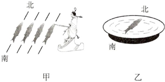 14. 人类最早的磁化技术出现在我国宋代。据《武经总要》记载,古人先将鱼形铁烧红,令铁鱼头尾指向南北,然后将其放入水中冷却,依靠地磁场获得磁性,再将其放入水中漂浮,制成指南鱼,如图甲所示;图乙是它静止时的指向。下列判断正确的是( )。