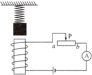 4. 如图,给电磁铁通电,铁块及弹簧在图中位置静止。当滑动变阻器的滑片P向a端滑动时,关于电流表示数和弹簧长度的变化情况,下列说法正确的是( )。