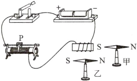 2. 在探究通电螺线管外部的磁场分布的实验中,开关断开时的小磁针甲、乙的指向如图所示,当开关闭合时,通电螺线管有磁性,则下列说法正确的是( )。