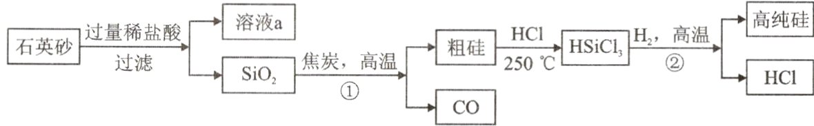 2. 芯片是用高纯硅制成的。下图是以石英砂为原料制备高纯硅的工艺流程(石英砂主要是SiO₂,含有少量的Fe₂O₃和Al₂O₃)。下列说法正确的是( )。
