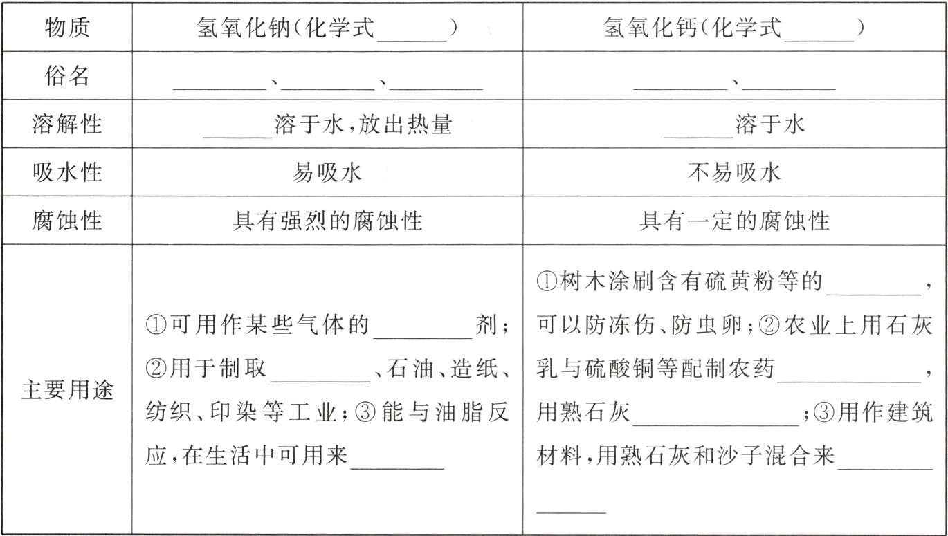 |主要用途|①可用作某些气体的____剂;②用于制取____、石油、造纸、纺织、印染等工业;③能与油脂反应,在生活中可用来____|①树木涂刷含有硫黄粉等的____,可以防冻伤、防虫卵;②农业上用石灰乳与硫酸铜等配制农药____,用熟石灰____;③用作建筑材料,用熟石灰和沙子混合来____|