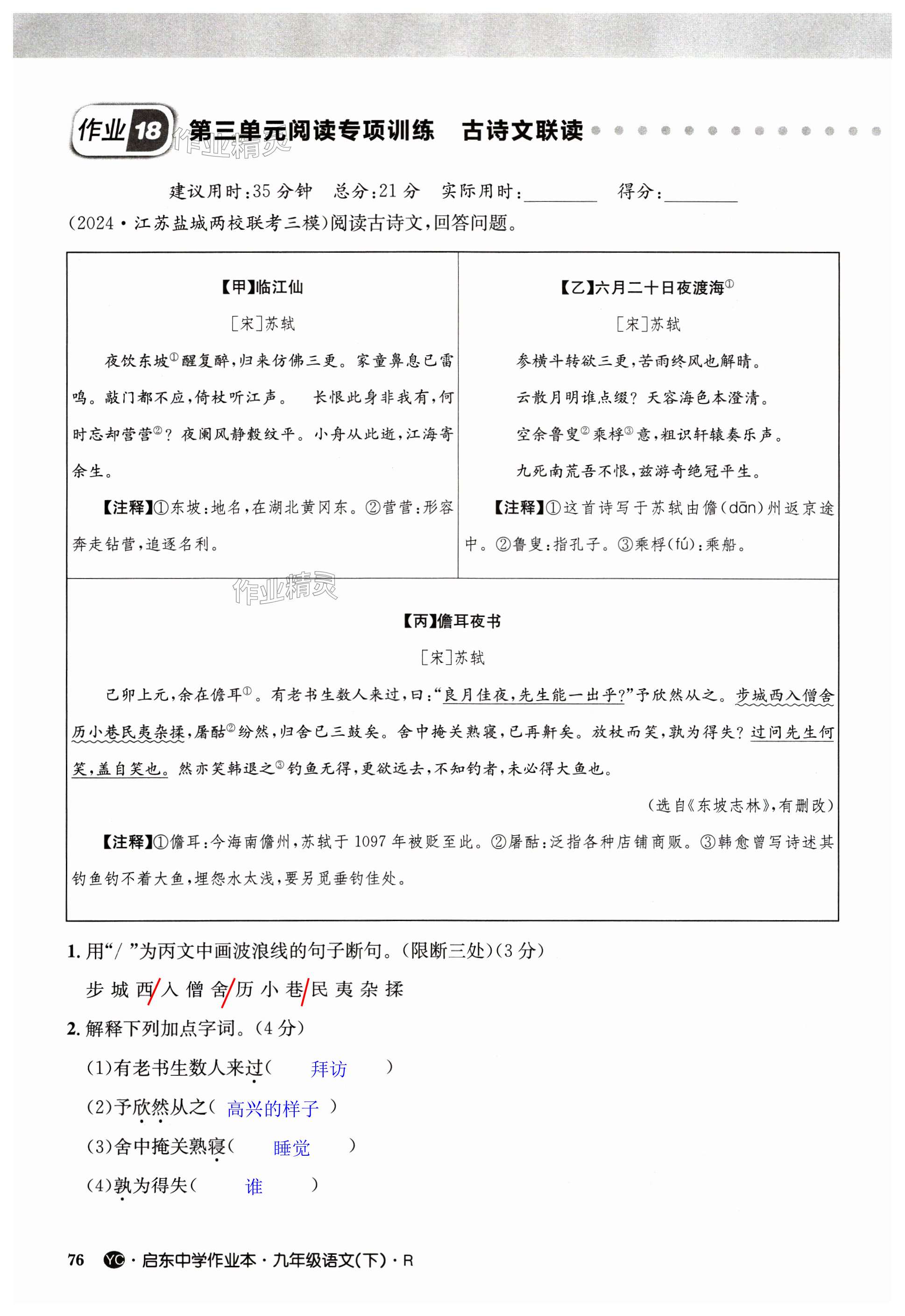 注:目前有些书本章节名称可能整理的还不是很完善,但都是按照顺序排列的,请同学们按照顺序仔细查找。练习册 2025年启东中学作业本九年级语文下册人教版盐城专版 答案主要是用来给同学们做完题方便对答案用的,请勿直接抄袭。