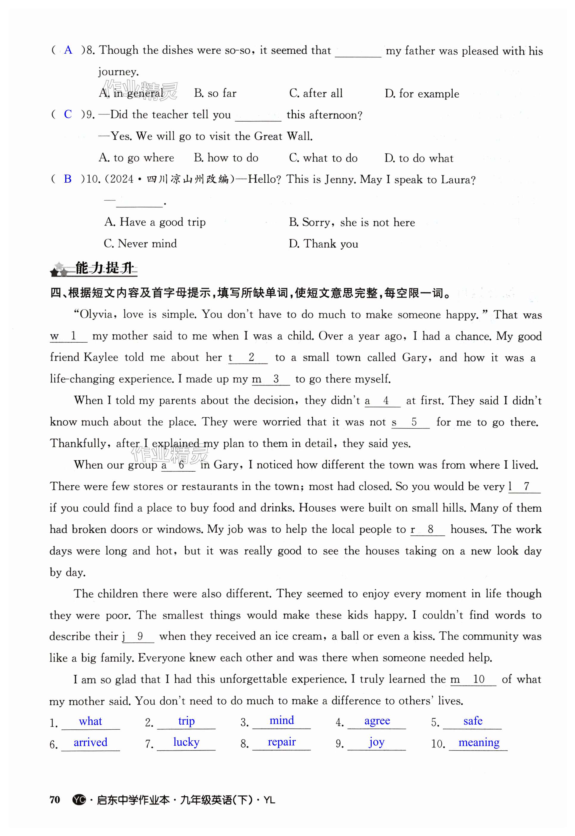 注:目前有些书本章节名称可能整理的还不是很完善,但都是按照顺序排列的,请同学们按照顺序仔细查找。练习册 2025年启东中学作业本九年级英语下册译林版盐城专版 答案主要是用来给同学们做完题方便对答案用的,请勿直接抄袭。
