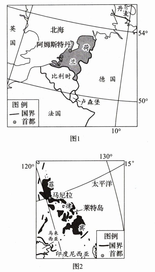 (2)从地理位置角度分别说明荷兰常受风暴潮影响、菲律宾常受台风影响的原因。