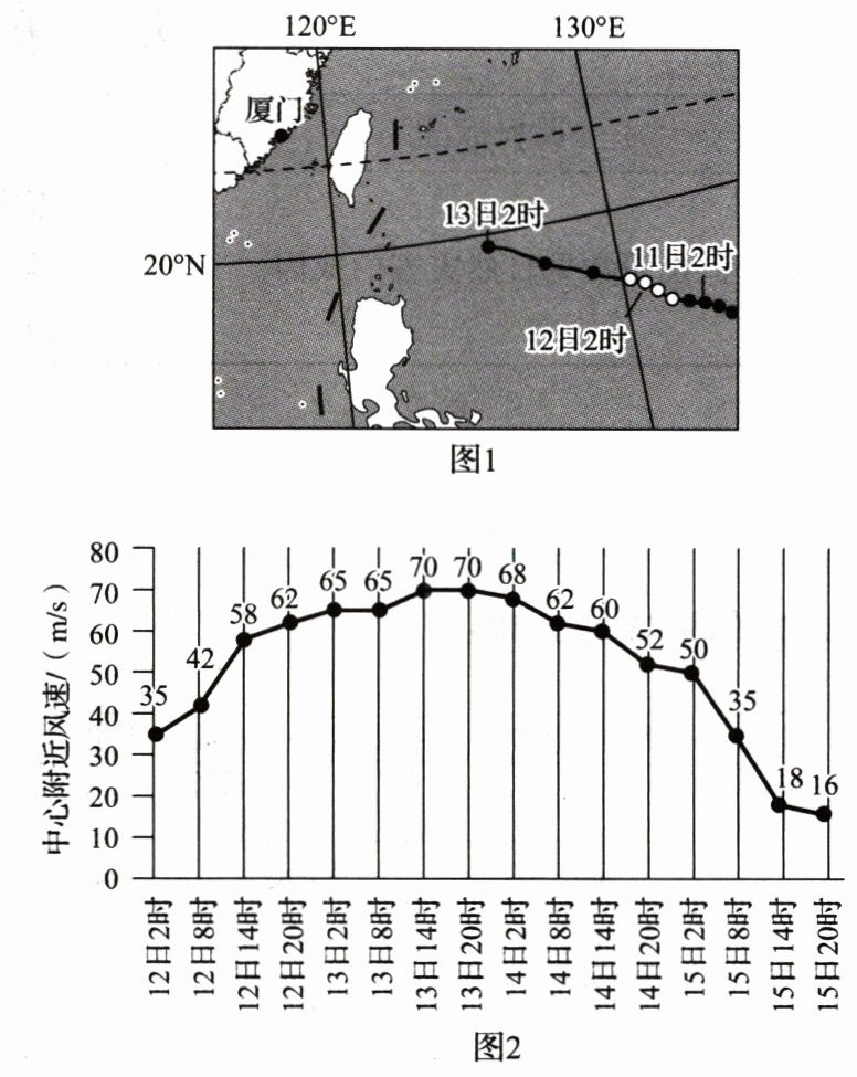 (1)根据台风中心附近风速变化,在图1中补绘完成“莫兰蒂”13日2时至15日3时的移动路径(无需标注时间点),并说明绘制理由。