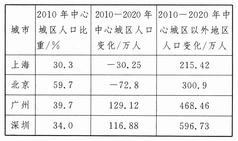 (2022·全国乙卷)中心城区通常为城市中人口最密集的区域。下表数据显示上海、北京、广州、深圳四城市2010年中心城区人口比重及2010-2020年中心城区和中心城区以外地区人口数量的变化。据此完成(1)~(3)题。