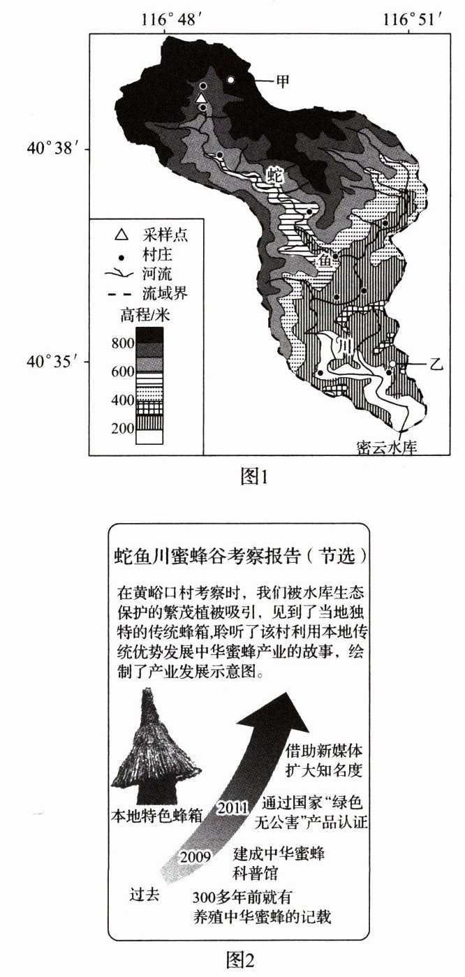 (2023·北京等级考)某校中学生赴蛇鱼川流域进行野外研学。图1为该流域示意图,图2为某同学撰写的考察报告。读图,回答下列问题。