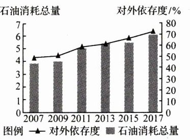 (2021·浙江6月选考)右图为我国2007 - 2017年石油消耗总量和对外依存度(石油净进口量/石油消耗总量×100%)统计图。完成(1)(2)题。