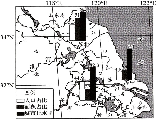 D. 苏北经济发展水平高于苏中,苏北非农业用地比重高于苏中