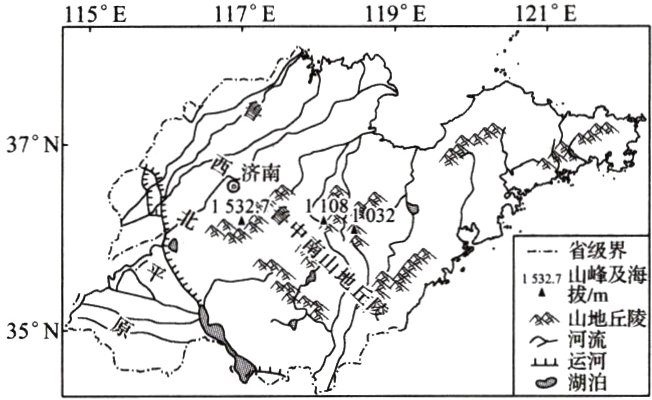 (1)与鲁西北平原地区相比,鲁中南山地丘陵地区地形多样,不适合粮食作物规模种植;气候温暖湿润,水、热、土组合多样,适宜种植多种农作物。(或与鲁中南山地丘陵地区相比,鲁西北平原地区地形平坦开阔,水、热、土组合相对单一,适合粮食作物规模经营。)