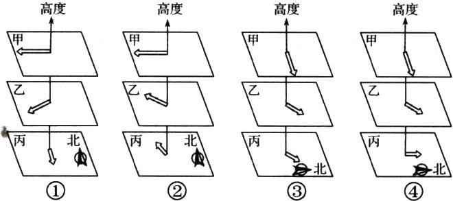 (2)最接近该地甲、乙、丙三个高程面上风向、风速的是 ( )